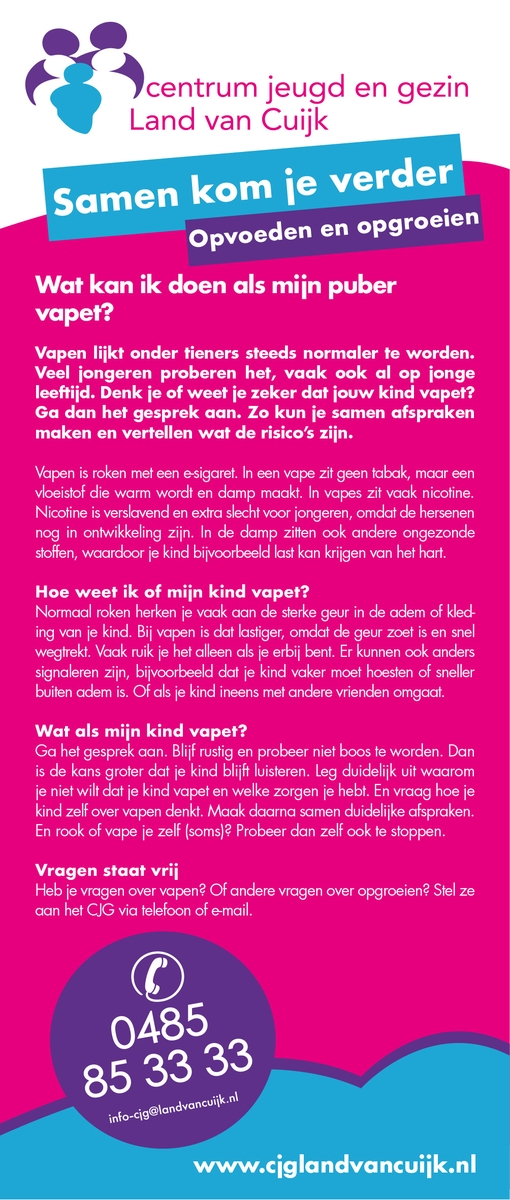 Het CJG is dé plek voor alle vragen, tips, ondersteuning, jeugdhulp en -zorg voor kinderen, jongeren (0 tot 23 jaar) en hun opvoeders. Naast het bieden van informatie en advies verzorgt het CJG ook Sociale Vaardigheids- trainingen en Kies Groepen (kinderen in echtscheidingssituaties) en cursussen voor ouders zoals Opvoeden Zo en de Pubercursus. We werken ook